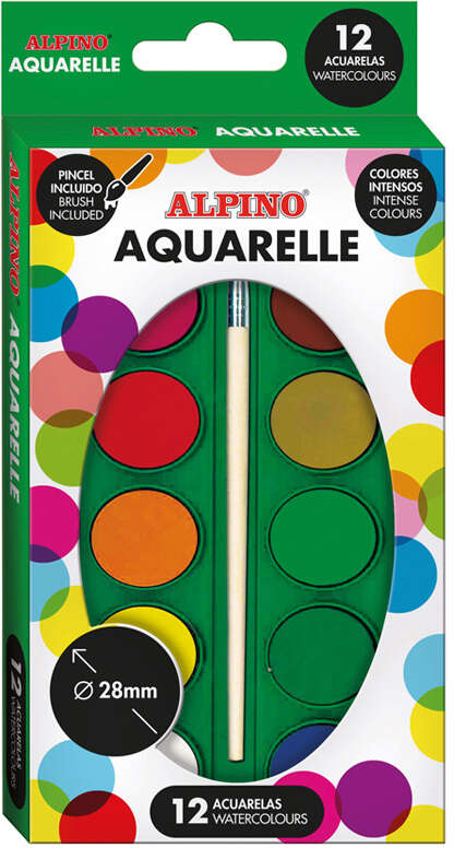 El Alpino Estuche 12 Acuarelas es un producto ideal para estudiantes y artistas que buscan un set de acuarelas de alta calidad. Este estuche incluye 12 pastillas de acuarela escolar con colores intensos y brillantes, con un diámetro de 28mm. Además, viene con un pincel incluido para facilitar su uso.