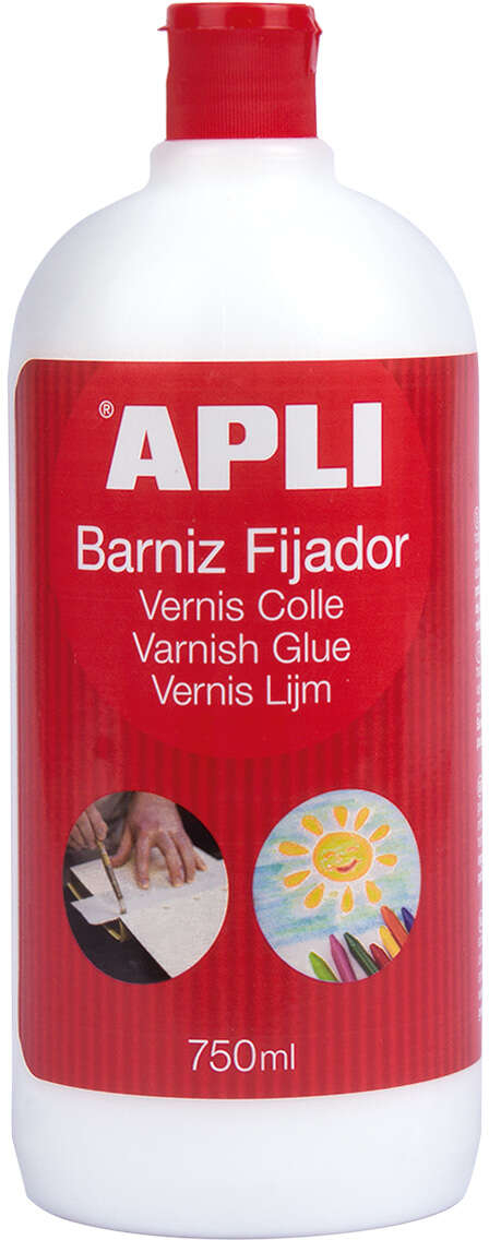 Barniz fijador con acabado brillante de 750 ml, perfecto para proteger y fijar dibujos a base de ceras, pinturas acrílicas y témperas, así como para dar un acabado barniz a manualidades hechas con la técnica de découpage. Este producto es ideal para trabajos escolares y manualidades, ya que no contiene disolventes y es apto para uso infantil. Su formato pequeño de 750 ml lo hace ideal para tener en casa y para uso individual.