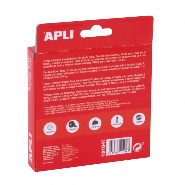 El rollo de cinta adhesiva doble cara de 19 mm x 3 m es una solución versátil y potente para todas tus necesidades de fijación. Diseñada para soportar objetos pesados, esta cinta es ideal para asegurar elementos en superficies planas con una adhesión instantánea por ambas caras.