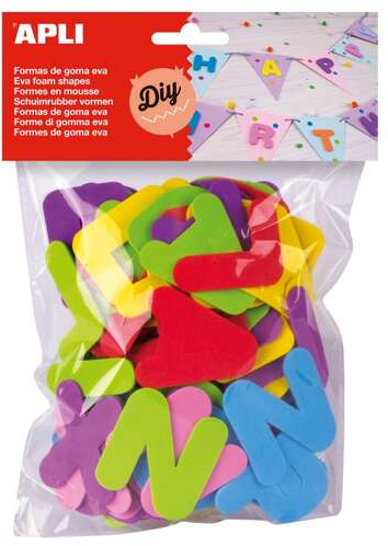 Letras de goma EVA en colores surtidos: rojo, verde, azul, amarillo, lila y rosa. Cada forma tiene una altura aproximada de 50 mm. Cada bolsa contiene 104 formas. Ideales para utilizar tanto en casa como en la escuela en manualidades, álbumes, tarjetas de felicitación, etc. Excelente herramienta para que los más pequeños empiecen a familiarizarse con las letras y crear palabras, con un material suave y seguro.