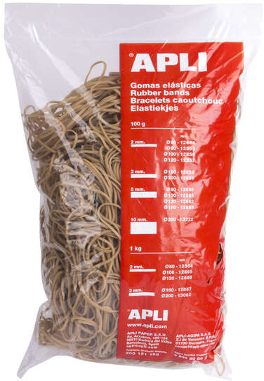 La bolsa de gomas elásticas tamaño Ø 80 x 2 mm es un producto de alta calidad y gran utilidad. Sus características incluyen una excelente resistencia y gran elasticidad, gracias a su fabricación con un 70% de caucho natural. Con un contenido de 1 kg, estas gomas elásticas son perfectas para ordenar y juntar objetos de manera puntual, así como para bricolaje y manualidades. Además, son un accesorio práctico e indispensable en cualquier escuela, hogar, oficina o taller. Encuentra la medida idónea para ti entre el gran surtido de gomas elásticas que APLI te ofrece.