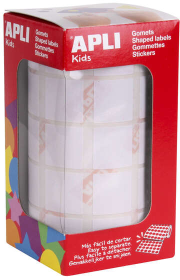 Rollo de gomets cuadrados de tamaño 20 x 20 mm en color blanco con adhesivo permanente.