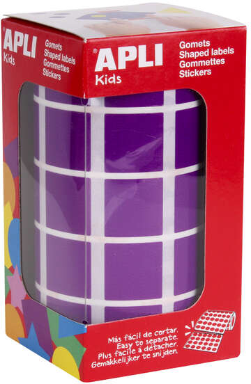 Rollo de gomets cuadrados de tamaño 20 x 20 mm en color lila con adhesivo permanente.
