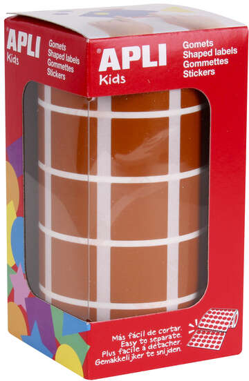 Rollo de gomets cuadrados de tamaño 20 x 20 mm en color marrón con adhesivo permanente.