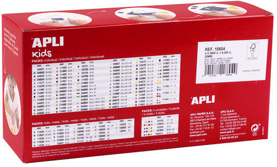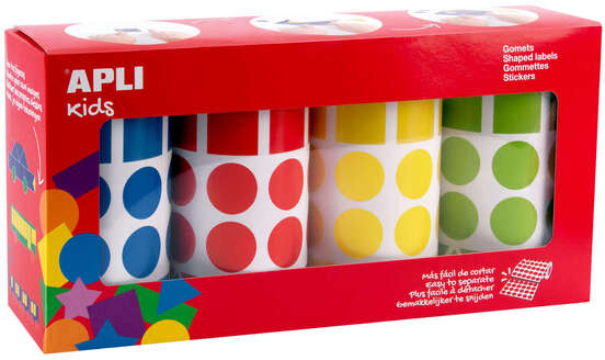 Pack de rollos de gomets geométricos surtidos en colores parchís: rojo, azul, amarillo y verde con adhesivo permanente. Cada pack contiene 4 rollos (uno por color) con un total de 8.260 gomets. Cada rollo contiene 59 hojas pretroqueladas para una fácil separación, 35 gomets por hoja y un tamaño de 20 mm. Este pack es perfecto para usar en guarderías y para que los más pequeños desarrollen la psicomotricidad fina y trabajen varias capacidades y habilidades como el conocimiento de los colores, las formas geométricas y los tamaños, la lógica y la creatividad, el trabajo en equipo y el dominio del espacio, entre otros. Además, los gomets APLI cumplen con las más estrictas normas de calidad y seguridad, fabricados conforme a las normas EN-71 y a la cadena de custodia FSC, adhesivo base agua, libre de disolventes, papeles ECF (Elemental Chlorine Free) y materiales 100% reciclables.