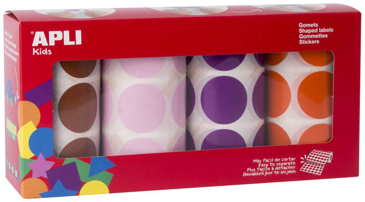 Pack de rollos de gomets redondos tamaño Ø 33 mm en colores surtidos: marrón, rosa, lila y naranja, con adhesivo permanente. El pack contiene 4 rollos (uno por color). Cada rollo contiene 59 hojas pretroqueladas para una fácil separación, un total de 2.832 gomets por pack.