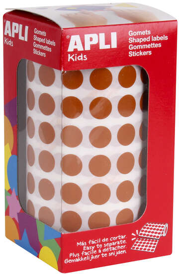 Rollo de gomets redondos de tamaño Ø 10,5 mm en color marrón con adhesivo permanente.