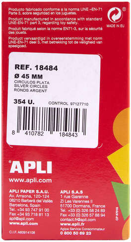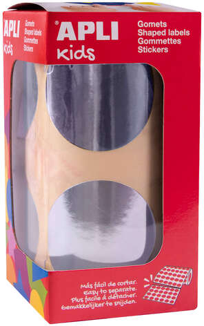 Los rollos de gomets redondos de Ø 45 mm en color plata metalizado con adhesivo permanente son el producto perfecto para utilizar en escuelas, guarderías, talleres infantiles o cualquier otro colectivo que trate con niños. Cada rollo contiene 59 hojas pretroqueladas para una fácil separación, cada hoja pretroquelada incluye 6 gomets metalizados, con un total de 354 gomets por rollo. El tamaño de Ø 45 mm es ideal para que los más pequeños los despeguen con mayor facilidad y comiencen a familiarizarse con los gomets.