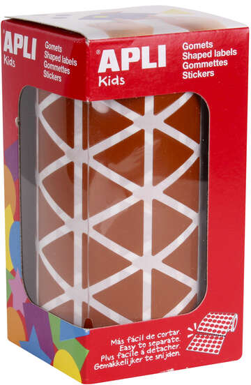 Rollo de gomets triangulares de tamaño 20 x 20 x 20 mm en color marrón con adhesivo permanente. Cada rollo contiene 59 hojas pretroqueladas para una fácil separación, un total de 2.832 gomets por rollo.