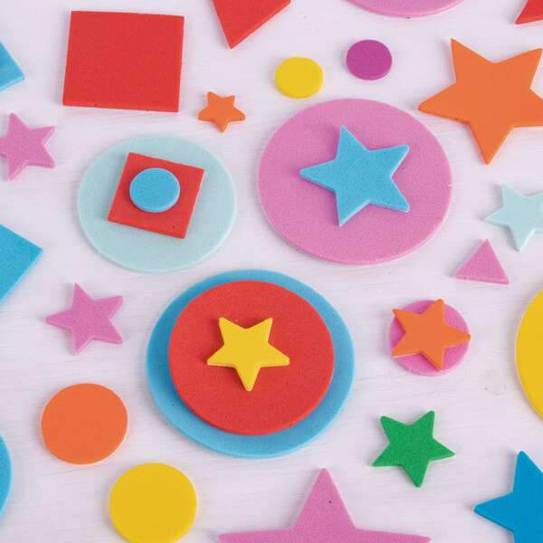 Formas de goma EVA surtidas, cada bolsa contiene 500 formas, 4 de cada: estrella, cuadrado, círculo, triángulo. Colores surtidos: amarillo, naranja, rojo, rosa, lavanda, azul cielo, azul oscuro, verde, azul gris, azul turquesa, azul pastel. Tamaños surtidos: 100 de 12 mm, 120 de 20 mm, 100 de 30 mm, 100 de 40 mm, 80 de 50 mm.