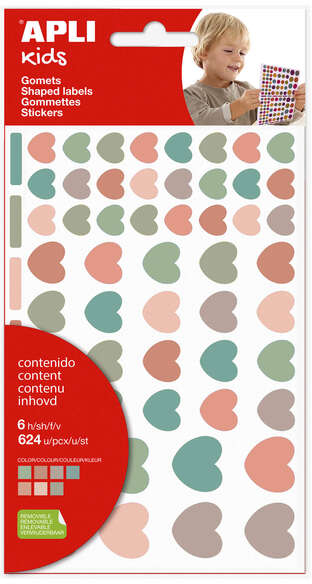 Bolsa de pegatinas con corazones de adhesivo removible en tamaños y colores Nordik surtidos: coral, terracota, verde pino, kaki, malva, rosa pastel, turquesa pastel. Cada bolsa contiene 6 hojas (624 gomets). Ideales para decorar tus objetos preferidos, tarjetas de felicitación, envolver regalos, etc.