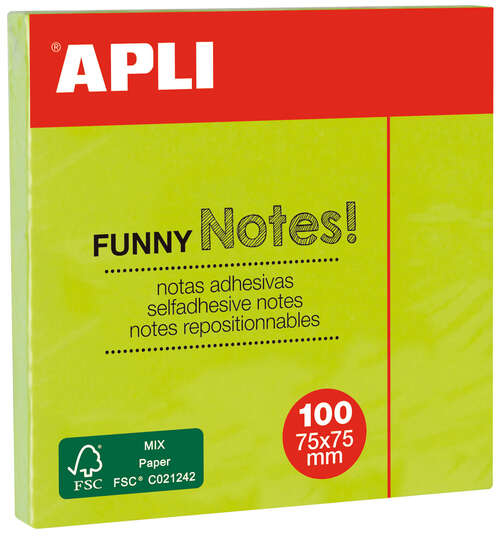 Este bloc de notas adhesivas es perfecto para aquellos que quieren destacar sus mensajes con colores llamativos y fluorescentes. Las notas "Funny" están fabricadas con papel certificado FSC y adhesivo en base agua, lo que las hace respetuosas con el medio ambiente. Además, su adhesivo reposicionable permite pegarlas y despegarlas más de una vez sin dejar residuos. Con un tamaño clásico de 75 x 75 mm, este bloc cuenta con 100 hojas de notas verdes flúor.