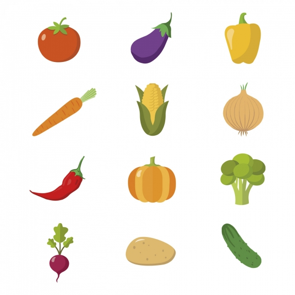 - Formas de hortalizas: tomate, brócoli, zanahoria, maíz, berenjena, pimiento, patata, guindilla, pepino, cebolla, rabanito y calabaza.
