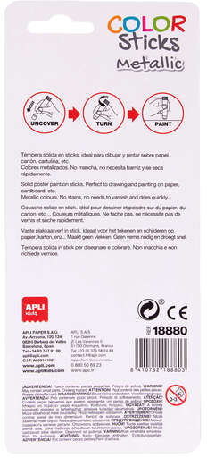 Las Témperas sólidas Color Sticks son un pack de 2 unidades de 6 g en colores metalizados: oro y plata. Son ideales para dibujar y pintar sobre papel, cartón, cartulina, etc. Los colores son perfectos para decorar invitaciones de cumpleaños, postales de navidad, dibujos, entre otros. Los Color Sticks de APLI no manchan y tienen un acabado satinado, por lo que no necesitan barniz. Además, secan rápidamente, en menos de 3 minutos. Los colores son nítidos, vivos e intensos. Puedes conseguir distintos acabados según la presión ejercida: Poca presión = efecto cera. Mucha presión = efecto témpera. Una vez finalizado el dibujo, no se quiebra, se mantiene flexible. No contienen disolventes y son recomendados para niños a partir de 3 años.