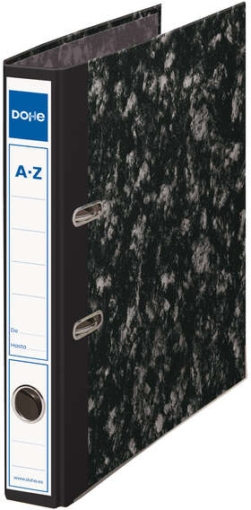 Archivadores jaspeados negros. Cartón forrado con papel impreso. Cantoneras metálicas, ollao, rado y palanca de máxima calidad.
