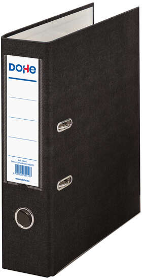 Fabricados en cartón rígido, forrado con polipropileno de colores en exterior y papel offset en el interior. Con ollao, rado, tarjetero para etiqueta en el lomo y cantonera larga metálica para reforzar los bordes inferiores. Mecanismo de palanca metálico niquelado de máxima calidad.