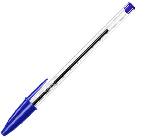 Boligrafo Bic Cristal numero 1 en todo el mundo. Cuerpo transparente. Tinta de aceite. Capuchon con clip y ventilado. Grosor del trazo: 0,4 mm.