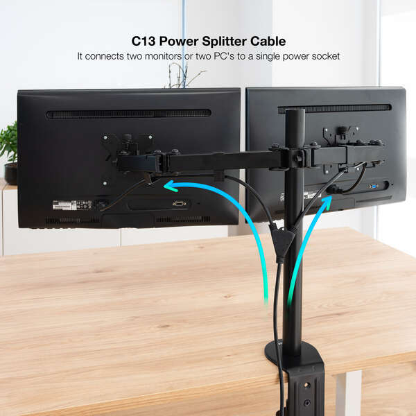 Conector CEE7 macho en un extremo y dos conectores C13 hembra en los otros.