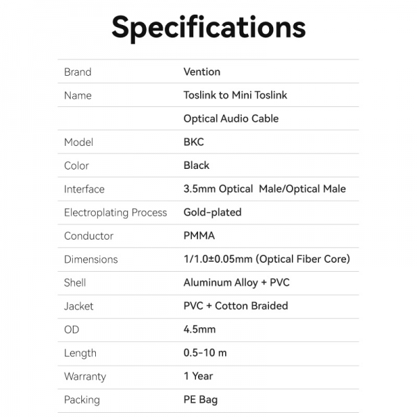 Vention Cable de Audio de Fibra Optica - 1.5m Especificaciones: -Tipo: Aleación de aluminio -Color del producto: Negro -Longitud del producto: 1.5m -Conexión del producto: Fibra óptica, boca cuadrada, boca opuesta -Diámetro del cable: Común