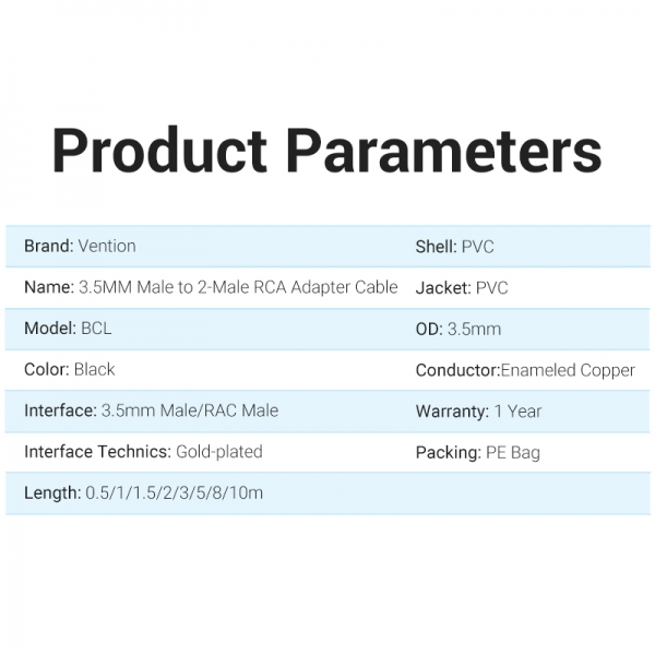 Vention Cable Estereo Jack 3.5 Macho a 2x RCA Macho - 10m Especificaciones: -Conexiones: 3,5 mm macho a 2RCA macho -Cable de audio -Color: negro -Longitud: 10m