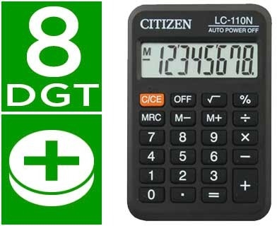 Calculadora de bolsillo de la marca Citizen. 8 digitos. Muy ligera. Color negro. Suma y resta de memoria. Medidas: 87 x 58 x 12 mm. Peso: 31 g.