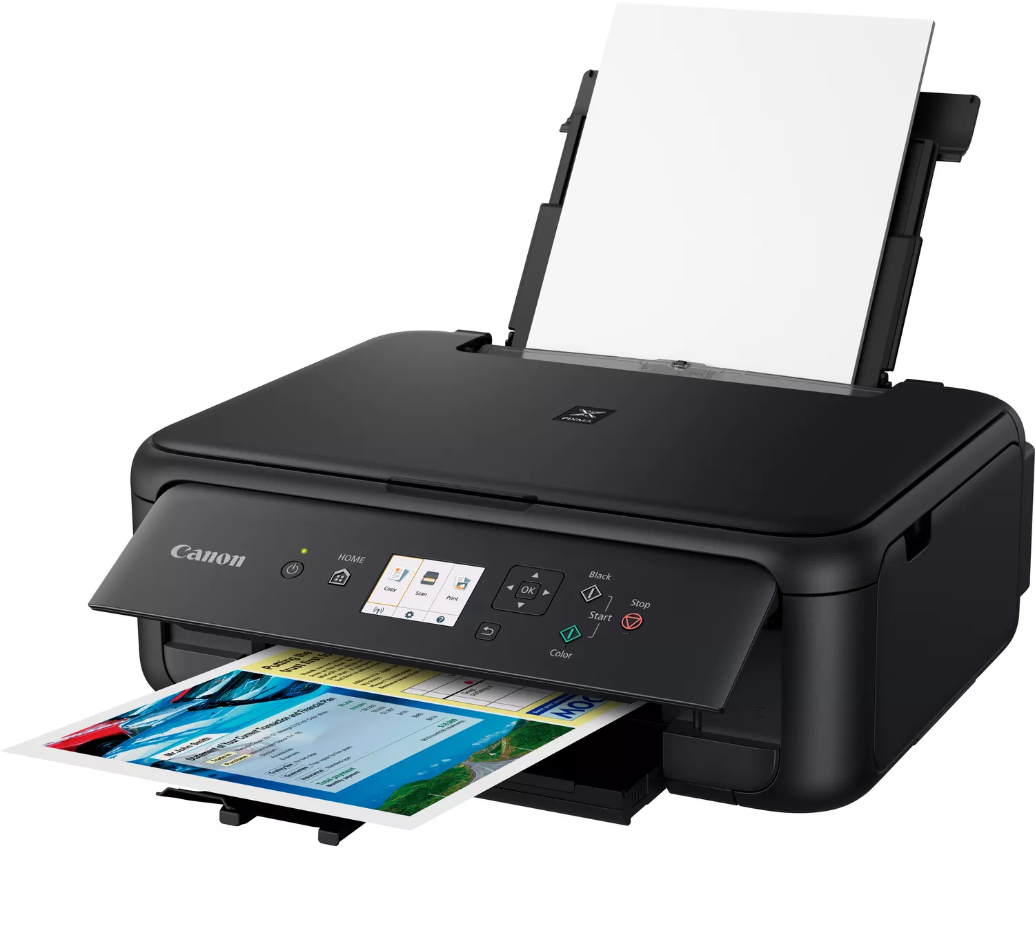 PIXMA serie TS5150 de Canon. Equipo multifunción conectado y asequible para el hogar con sencillas funciones inalámbricas de impresión en color, copia y escaneo desde dispositivos móviles.