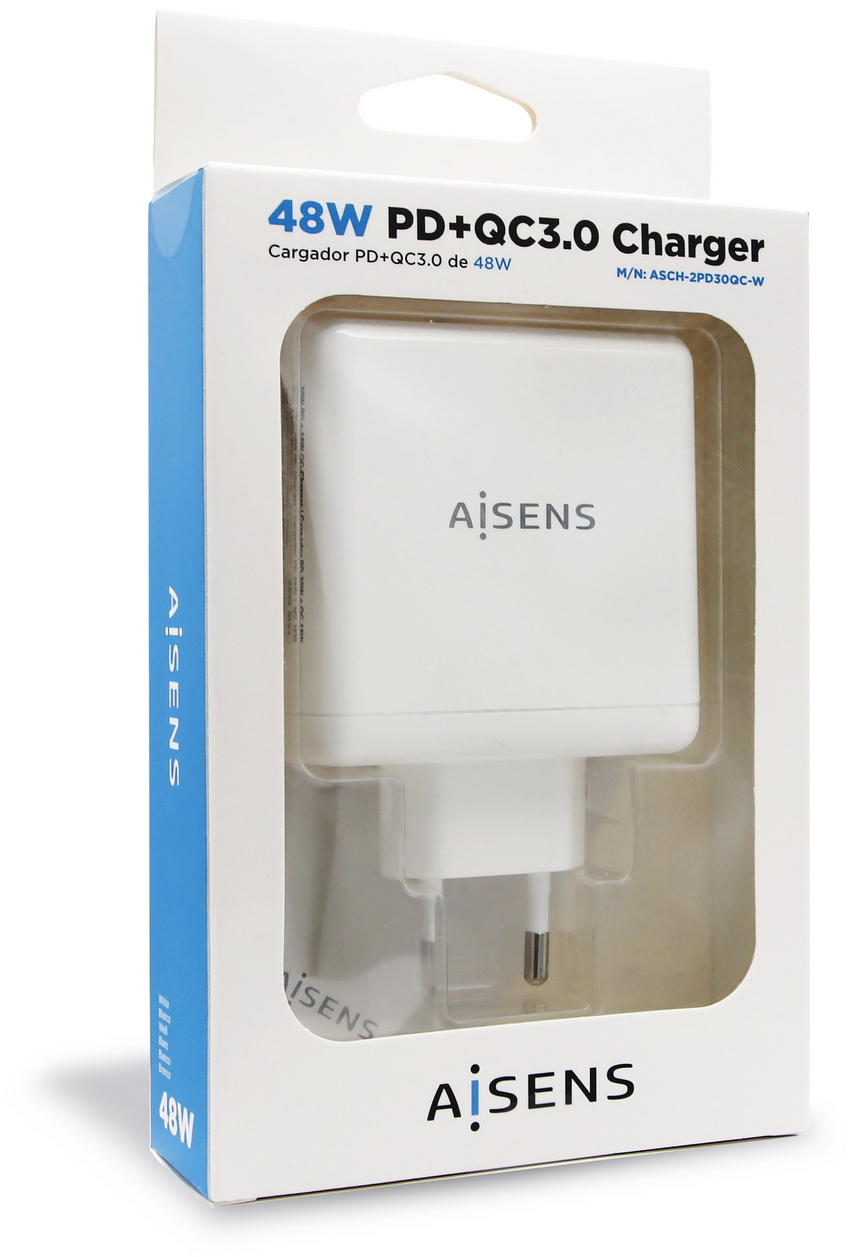 Aisens Cargador para Smartphone 48W 1x USB-C PD3.0 30W, 1x USB-A QC3.0 18W