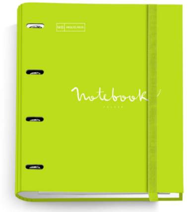 Carpeta cartón forrado y plastificado mate. Tamaño A4 4 anillas 35mm tipo D. Equipada con 1 bloc notebook de 100 hojas de 70gr y cierre con goma. Tamaño 21x97cm.