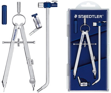 Estuche con compás, tubo de minas, alargadera y adaptador universal de rosca. Articulado en un brazo. Longitud: 15,4 cm. Circunferencia: 26,5 cm.