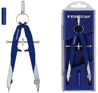 Compás metálico de precisión con husillo y ajuste por rueda central, diámetro máximo del círculo 225 mm. Estuche de plástico con tapa transparente con: compás y tubo de minas.