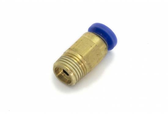 En un lado tiene una rosca de 1/8" y en el otro un conector para tubo de teflón de 4mm de diámetro.