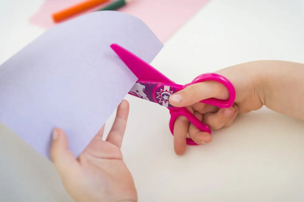 Tijeras infantiles coloridas con motivos adecuados para la edad.