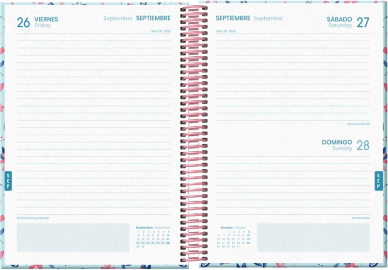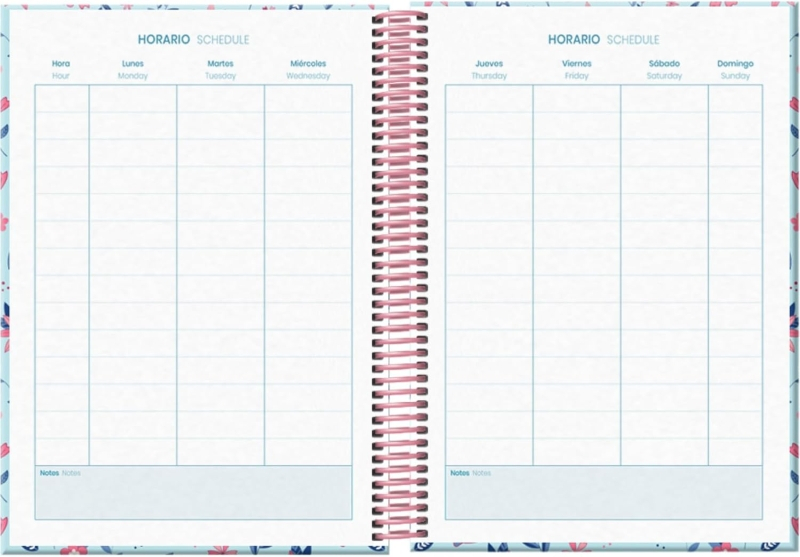 Dohe Blossom Agenda escolar dia pagina. Todos los días de la semana ocupan un página excepto sábado y domingo que comparten hoja. La cubierta está fabricada en cartón forrado con papel impreso a todo color y plastificado. Guardas impresas. Espiral simple de plastico y cierre con goma elástica plana.