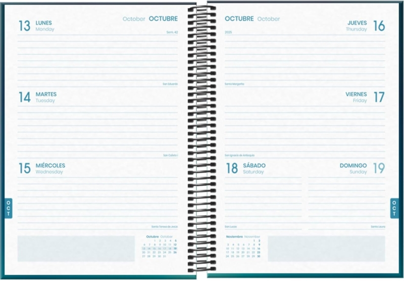 Dohe Boreal Agenda escolar semana vista. Todos los días de la semana en dos hojas. La cubierta está fabricada en cartón forrado con papel impreso a todo color y plastificado. Guardas impresas. Espiral simple de plastico y cierre con goma elástica plana.