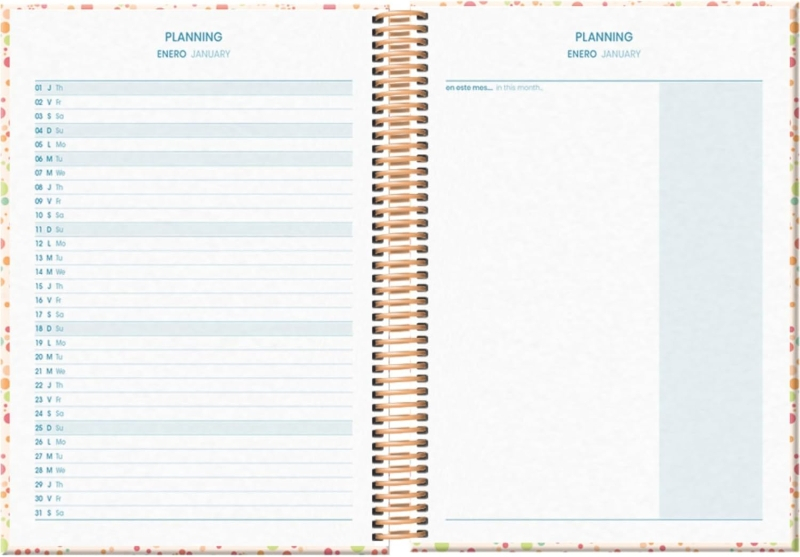 Dohe Bubbles Agenda escolar dia pagina. Todos los días de la semana ocupan un página excepto sábado y domingo que comparten hoja. La cubierta está fabricada en cartón forrado con papel impreso a todo color y plastificado. Guardas impresas. Espiral simple de plastico y cierre con goma elástica plana.