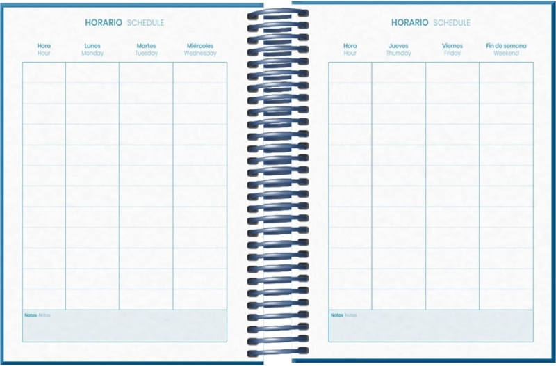 Dohe Logic Agenda escolar dia pagina. Todos los días de la semana ocupan un página excepto sábado y domingo que comparten hoja. La cubierta está fabricada en cartón forrado con papel impreso a todo color y plastificado. Guardas impresas. Espiral simple de plastico y cierre con goma elástica plana.