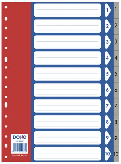 Separadores para archivadores y carpetas de anillas. Fabricados en polipropileno de 120 micras con multitaladro de 16 perforaciones. Se sirven en bolsa autoadhesiva individual.