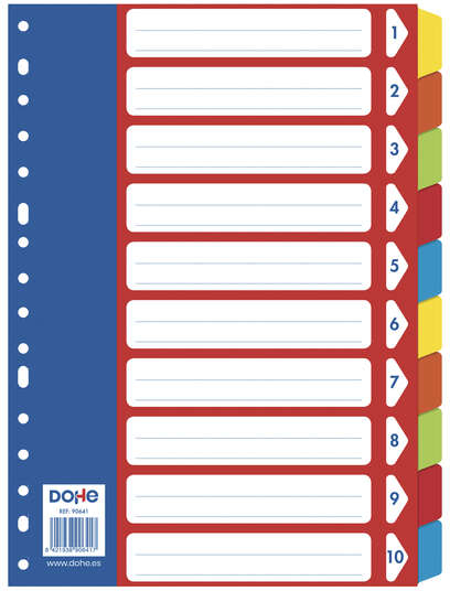 Separadores para archivadores y carpetas de anillas. Fabricados en cartulina de 180 gr con multitaladro de 16 perforaciones. Se sirven en bolsa autoadhesiva individual.