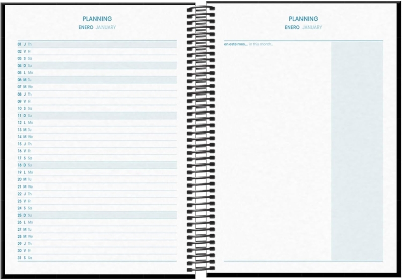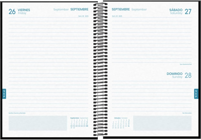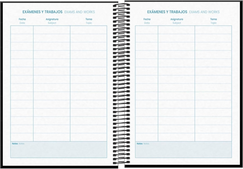 Dohe System Agenda escolar dia pagina. Todos los días de la semana ocupan un página excepto sábado y domingo que comparten hoja. La cubierta está fabricada en cartón forrado con papel impreso a todo color y plastificado. Espiral simple metalico.