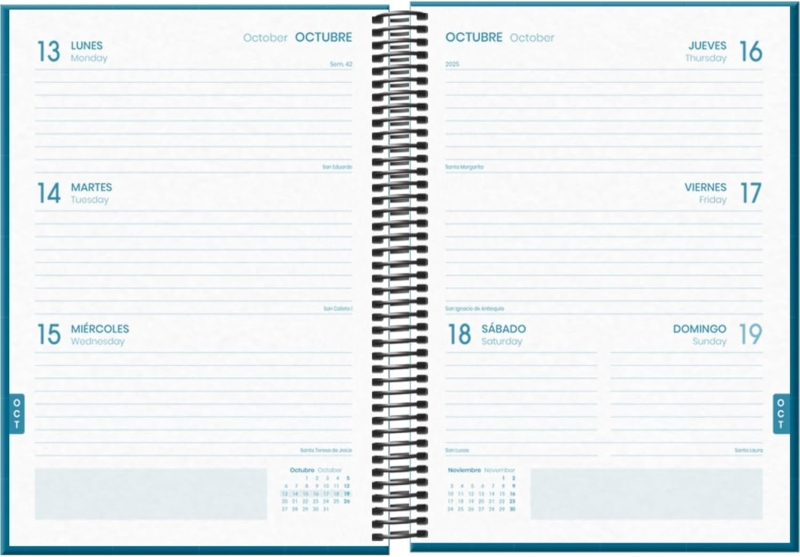 Dohe System Agenda escolar semana vista. Todos los días de la semana en dos hojas. La cubierta está fabricada en cartón forrado con papel impreso a todo color y plastificado. Espiral simple metalico.