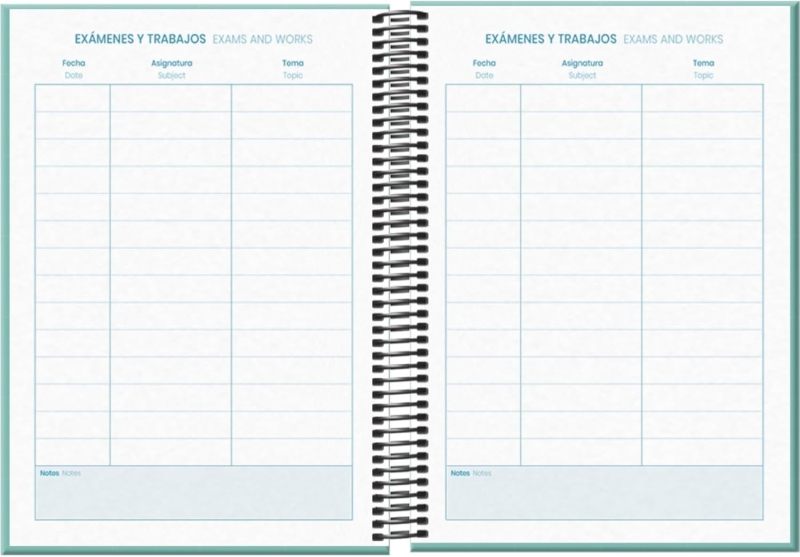 Dohe System Agenda escolar semana vista. Todos los días de la semana en dos hojas. La cubierta está fabricada en cartón forrado con papel impreso a todo color y plastificado. Espiral simple metalico.