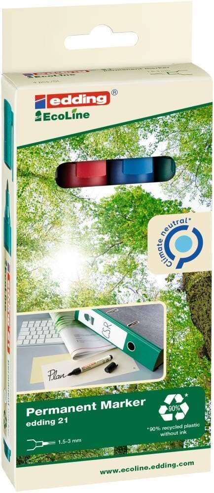 Lo viejo cobra nueva vida con el marcador permanente edding 21 EcoLine. Al menos el 90 % del plástico utilizado procede de materiales reciclados, y el 83 % de ese plástico procede de plástico de postconsumo, como el de las regaderas o los envases de yogures usados. Esto lo convierte en el asistente ideal para darle un toque más verde a cualquier negocio o institución. Su punta redonda garantiza un flujo uniforme y suave de la tinta.