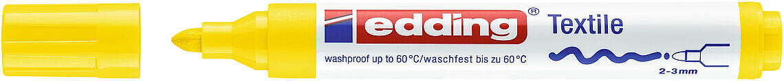 El marcador cuenta con una resistente punta redonda de 2-3 mm de grosor y está disponible en una gran variedad de colores sorprendentes y tonos fluorescentes. Para uso limitado sobre poliéster, ya que es frecuente que se corra la tinta. Recomendamos usar el marcador textil edding 8040 para escribir sobre poliéster (p. ej., prendas deportivas).