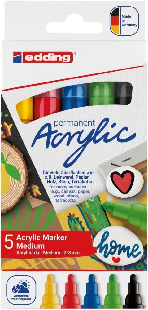 ¡El todo en uno en la gama de los acrílicos! ¿Estás buscando un marcador acrílico que te sirva para todo? ¡Deja de buscar! El edding marcador acrílico de trazo medio es todo lo que necesitas. Con su punta redondeada de tamaño medio y un ancho de trazo de 2-3 mm, podrás dibujar líneas y formas con precisión en un lienzo.
