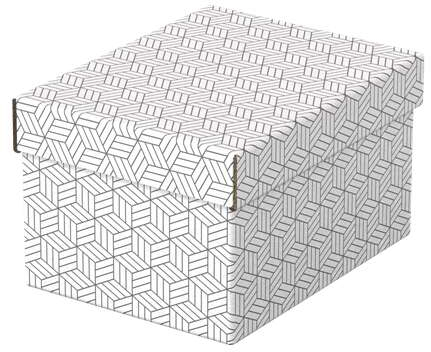 Cajas de almacenamiento de cartón elegantes y modernas con tapa extraíble ideales para empaquetar regalos o crear almacenamiento instantáneo en casa. Juego de tres cajas del mismo tamaño para usar individualmente, para guardar cosas en estantes o crear espacios de almacenamiento todas juntas, para mantener organizados y fáciles de encontrar artículos más pequeños como fotografías y documentos personales. ¡Añádele un poco de cinta y úsala para empaquetar un regalo! Una vez abierto, el destinatario puede reutilizarlo para almacenar artículos en el hogar, así que tienes 2 regalos en uno. Hecho de cartón corrugado resistente, 100% reciclado y 100% reciclable, certificado FSC. La superficie, que se limpia con un paño, tiene un acabado con un diseño geométrico de dos colores para agregar estilo a tu espacio de almacenamiento. Se suministra en paquete plano y es rápido y fácil de montar. Los lados se pliegan sobre sí mismos durante el montaje para proporcionar el doble de resistencia, asegurando que las cajas se mantengan fuertes y protejan el contenido.