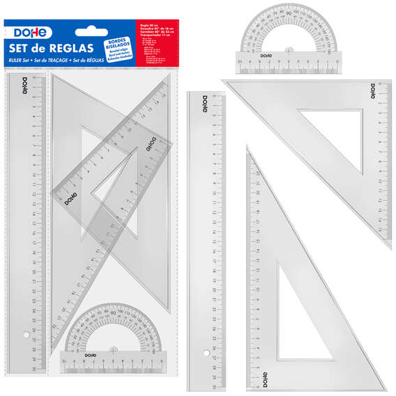 Set de reglas. Regla, escuadra, cartabón y transportador de plástico inyectado transparente cristal. Cantos biselados y con reborde.
