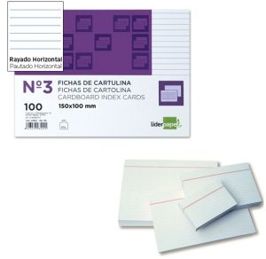 Fichas de Cartulina rayadas del número 3 Tamaño : 100x150 mm 1 linea horizontal Cartulina offset de 200/180 gramos/m2 en paquetes de 100 fichas.