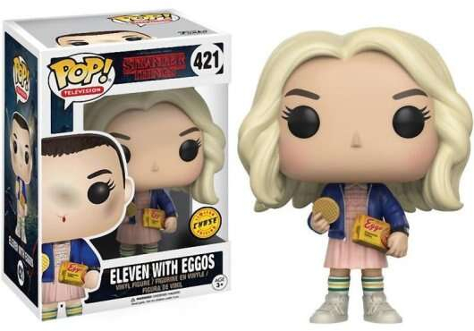 Funko amplía su gama con las figuras POP de Stranger Things, basadas en la serie de Netflix del mismo nombre. La figura de Eleven está disponible con el vestido rosa y la chaqueta vaquera que lleva cuando visita el colegio de los chicos: Mike, Dustin y Lucas. En esta versión Chase, lleva una peluca rubia para ocultar su cabeza casi rapada. Bajo el brazo lleva un paquete de gofres Eggo, que le encantan.
