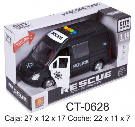 Furgoneta escala 1:16. Modelo Policia. Con luz y sonido. Las medidas del artículo son: Caja: 27 x 12 x 17 cm. Coche: 22 x 11 x 7 cm.