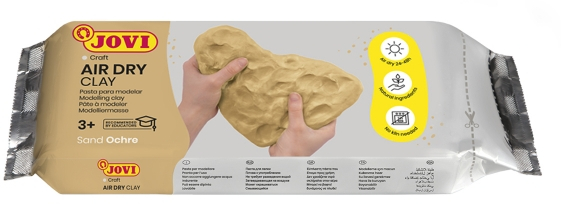 Jovi Air Dry es una pasta de modelar de tacto fresco y agradable, la pasta se presenta húmeda y es muy fácil de moldear. Se puede utilizar para cubrir diferentes superficies como madera, plástico, cartón, vidrio o metal. Se seca al aire en 24 horas, dependiendo del grosor de la manualidad. El acabado es fino y suave y se puede decorar con cualquier tipo de pinturas de base agua, acrílicas, rotuladores especiales o barniz. Después, sólo hay que dejarla secar al aire de forma natural durante 24 horas, evitando tener que trabajar con hornos a alta temperatura.